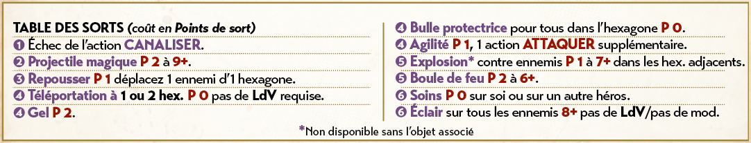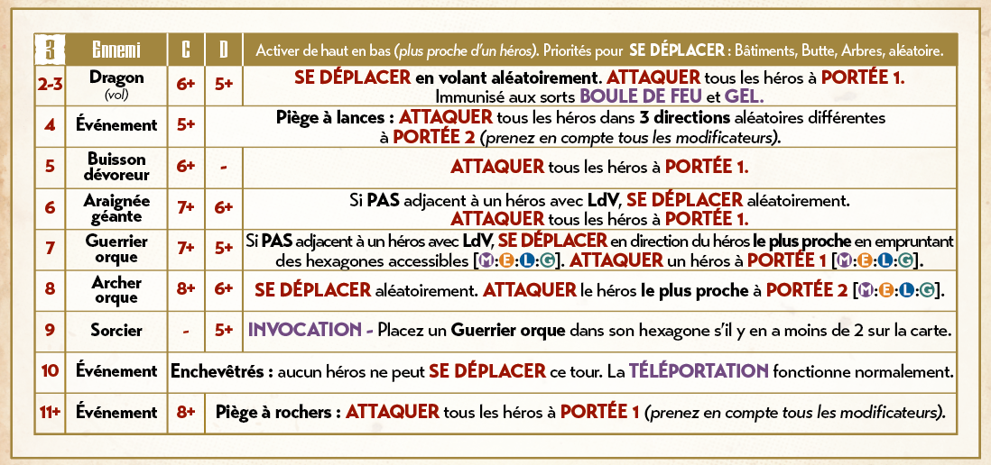 Chaque ennemi a un comportement, indiqué la table, ainsi qu’une valeur de combat et une portée pour ses attaques. Certains ennemis lancent également des sorts !