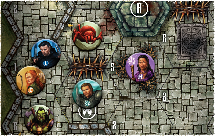 Dans chaque quête, vos héros commencent « en bas de la carte » et doivent progresser jusqu’à l’hexagone de sortie, située de l’autre côté.