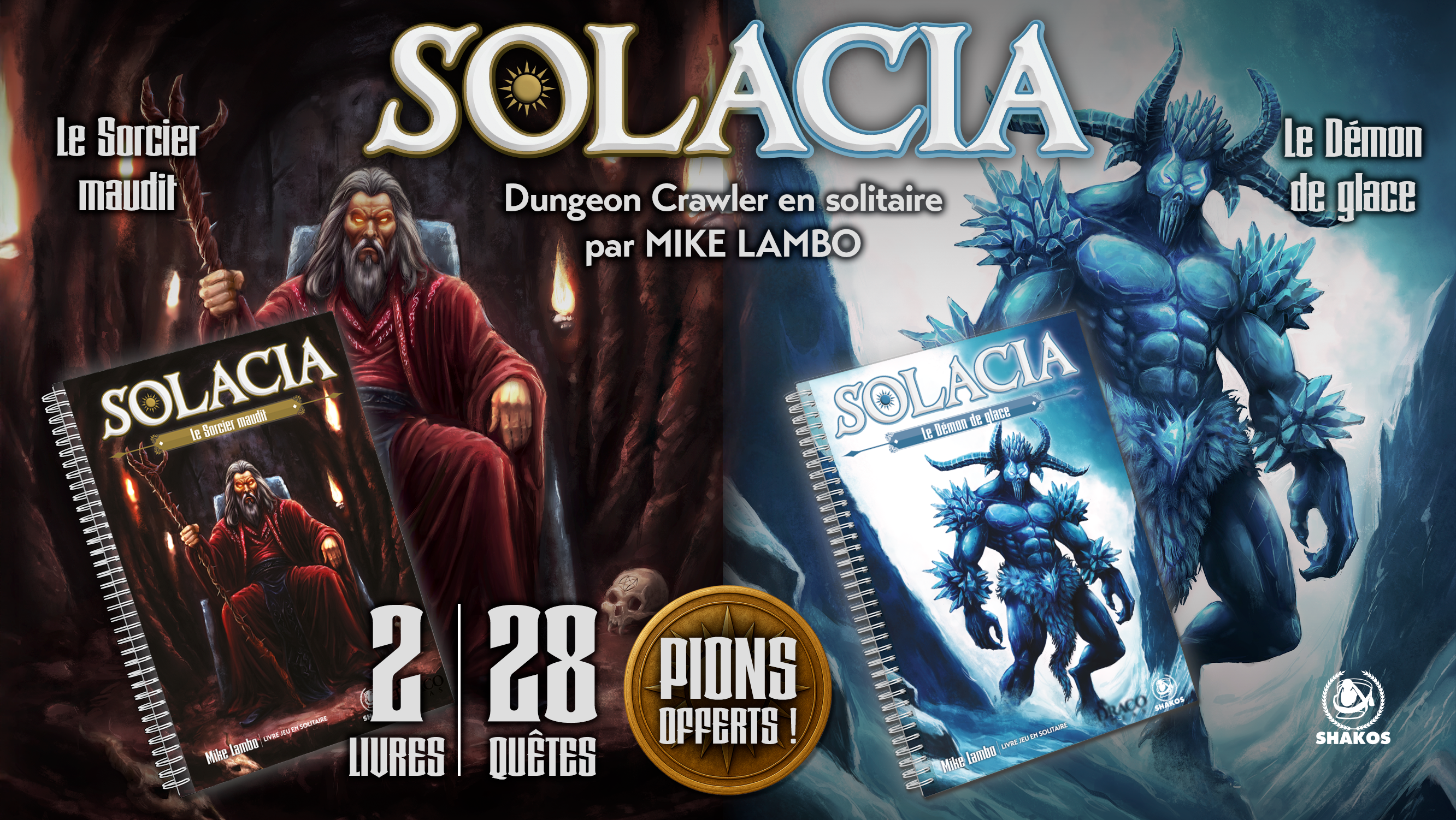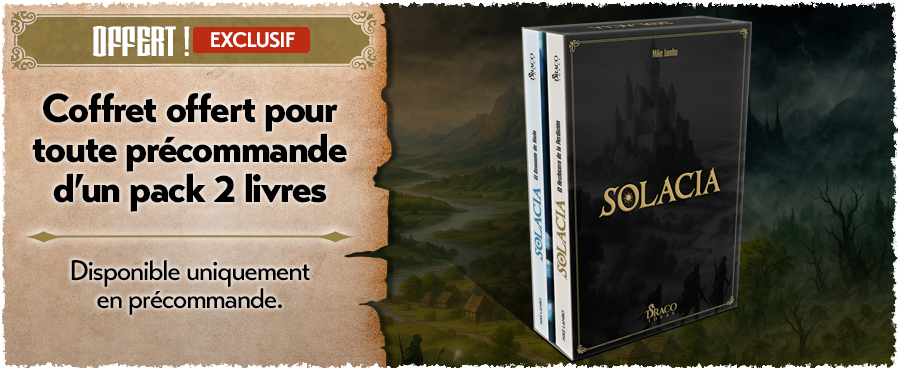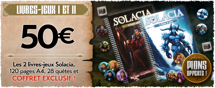 Après avoir publié Sherman Solitaire et Les Aigles, nous vous entraînons maintenant dans le monde fantastique de Solacia ! Ce n’est pas un, mais deux livres-jeux que nous vous proposons pour vivre des aventures palpitantes en solitaire et retrouver les sensations d’un Dungeon Crawler (exploration de donjons). Vous devrez mener votre groupe de 4 héros à la victoire pour chasser les menaces qui pèsent sur le monde de Solacia. Vous pourrez aussi jouer en mode coopératif (en vous répartissant la gestion des héros) et en mode Duel (arène et seul contre tous).