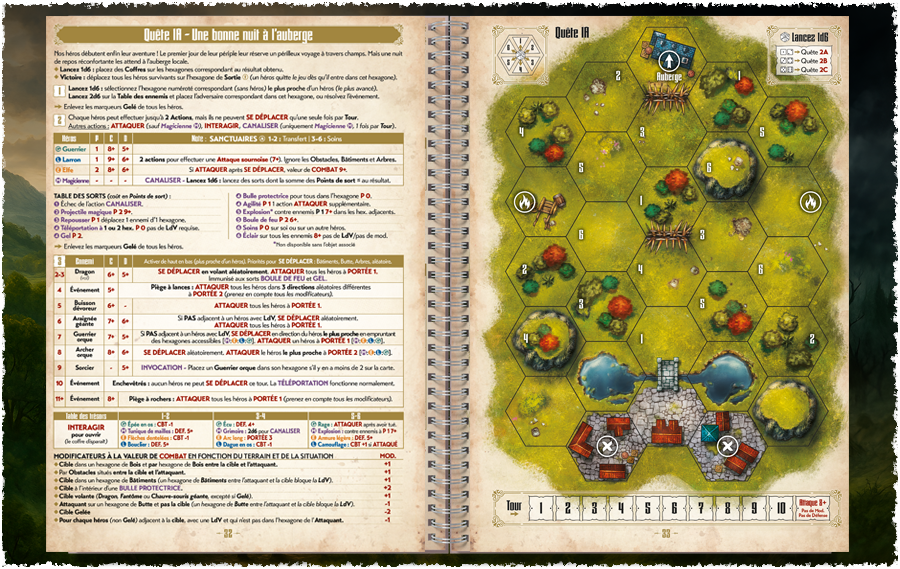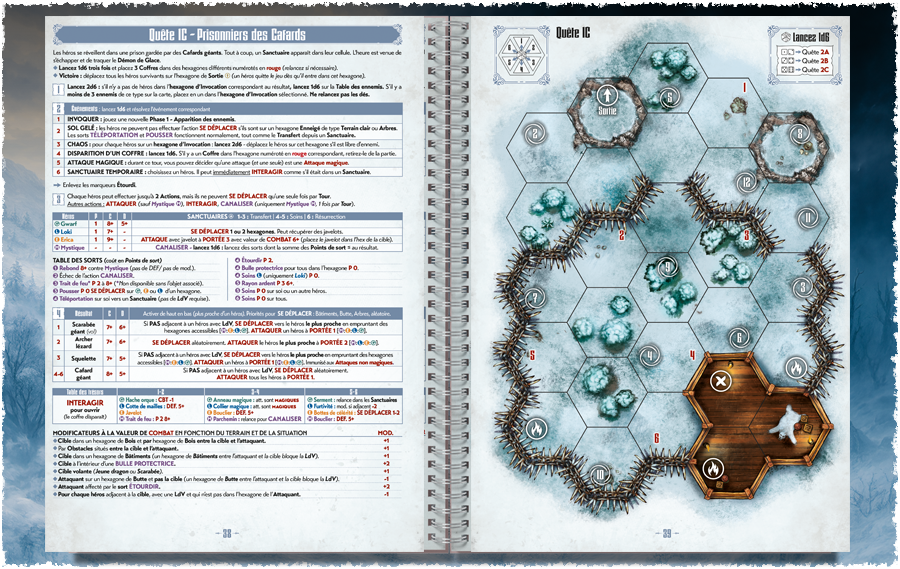 Une fois la phase des héros terminée, les ennemis présents sur la carte seront activés à leur tour, grâce à la Table d’activation des ennemis spécifique à chaque quête. Toutes les informations importantes concernant chaque scénario sont regroupées sur la page en vis à vis de la carte.